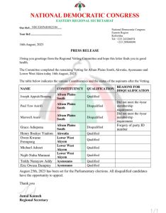 The disqualified 3 are Paul Yaw Asirifi (did not meet the 4 year membership requirement), Maxwell Asare (did not meet the 4 year membership requirement) and Grace Adiepena (forgery of party ID number).